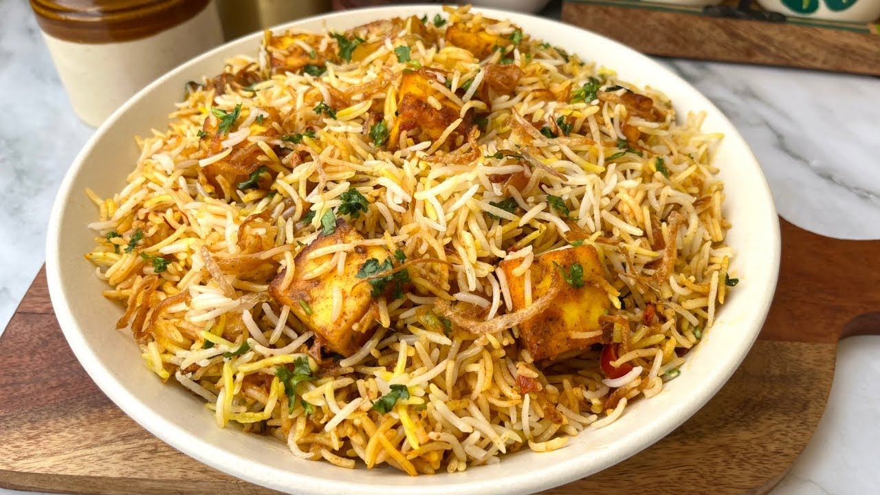 Spiced basmati rice layered with paneer—rich, indulgent, and aromatic.