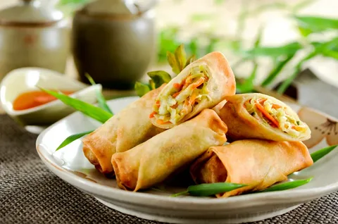 Golden-fried rolls stuffed with seasoned veggies—crunchy, light, and addictive.